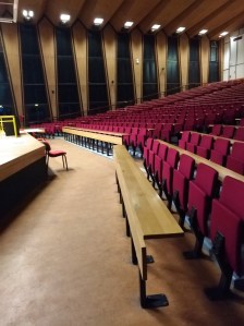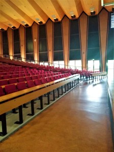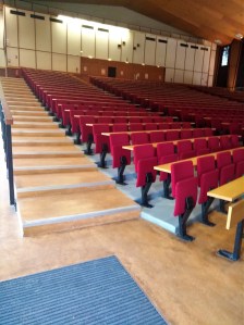 - Dans les gradins de l’amphithéâtre, 14 places adaptées pour les personnes en fauteuil roulant ont été aménagées. Une place pour un accompagnant a été intégrée pour chaque place réservée aux fauteuils roulants. Des tablettes coulissantes permettent une installation aisée en partie basse de l’amphithéâtre, et des tablettes élargies donnent du confort en partie haute.