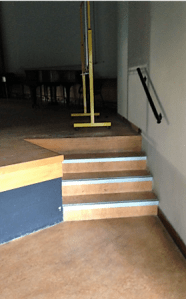 - Des escaliers non adaptés à des personnes présentant un handicap visuel avec le manque de contrastes visuels et de main courantes.